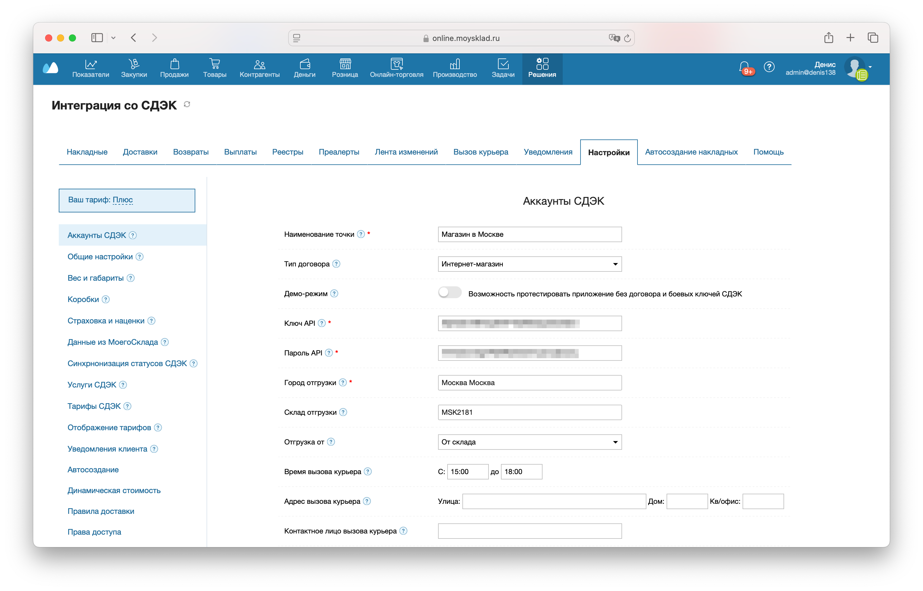 - если у вас несколько складов или городов отгрузки (вы можете использовать одни и те же ключи API с разными городами отгрузки и другими параметрами)