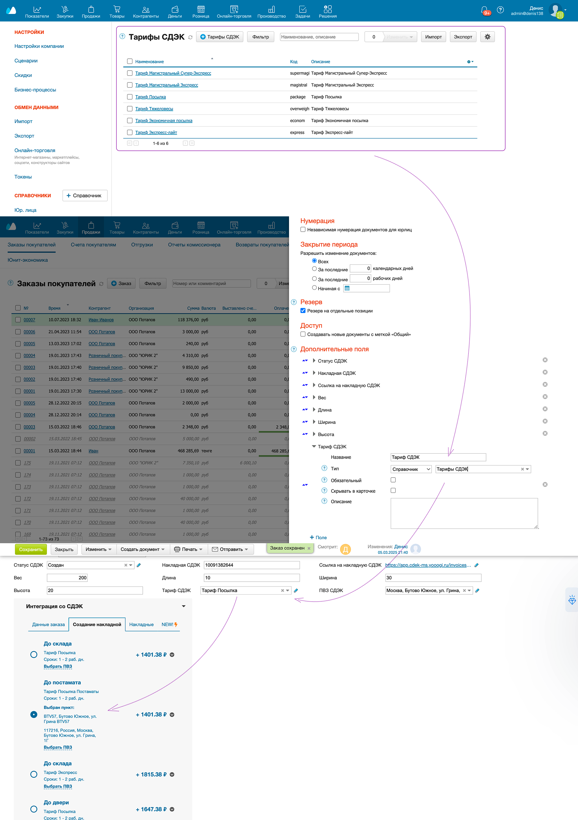 Доп поле должно быть типа Справочник [Тарифы СДЭК]