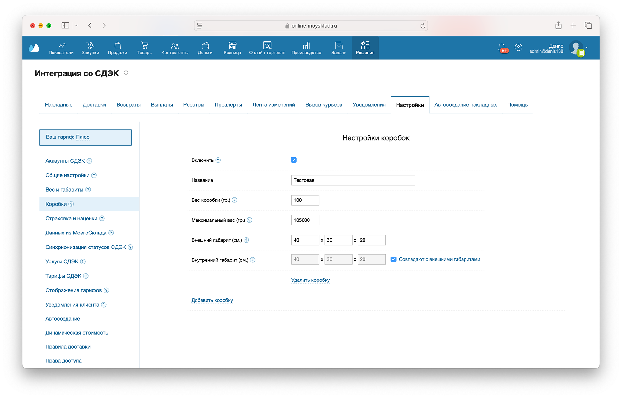 После добавления коробки, она будет доступна при редактировании мест в виджете приложения. При выборе коробки ее габарит принимается за габариты места, а вес добавляется к весу товаров