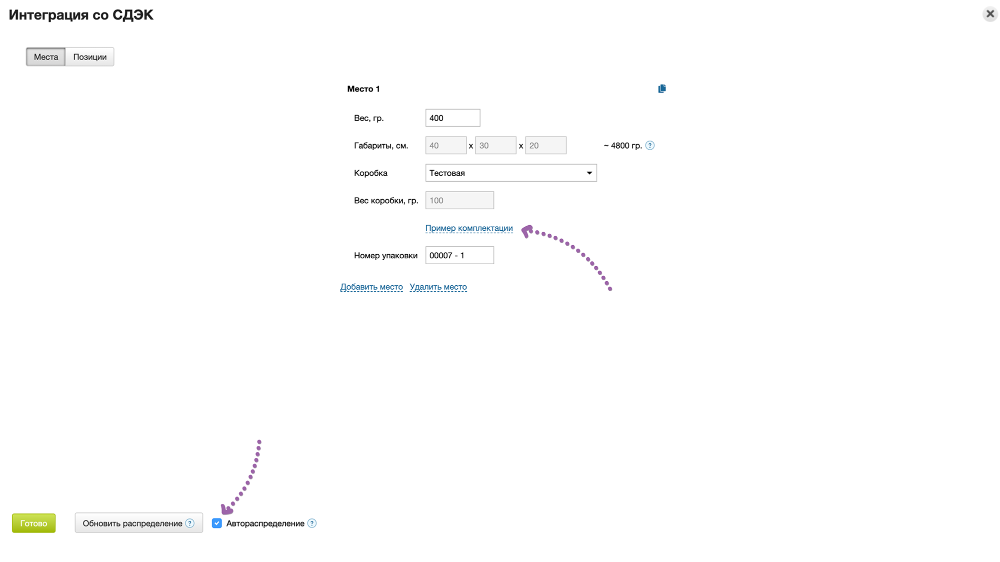После добавления коробки, она будет доступна при редактировании мест в виджете приложения. При выборе коробки ее габарит принимается за габариты места, а вес добавляется к весу товаров
