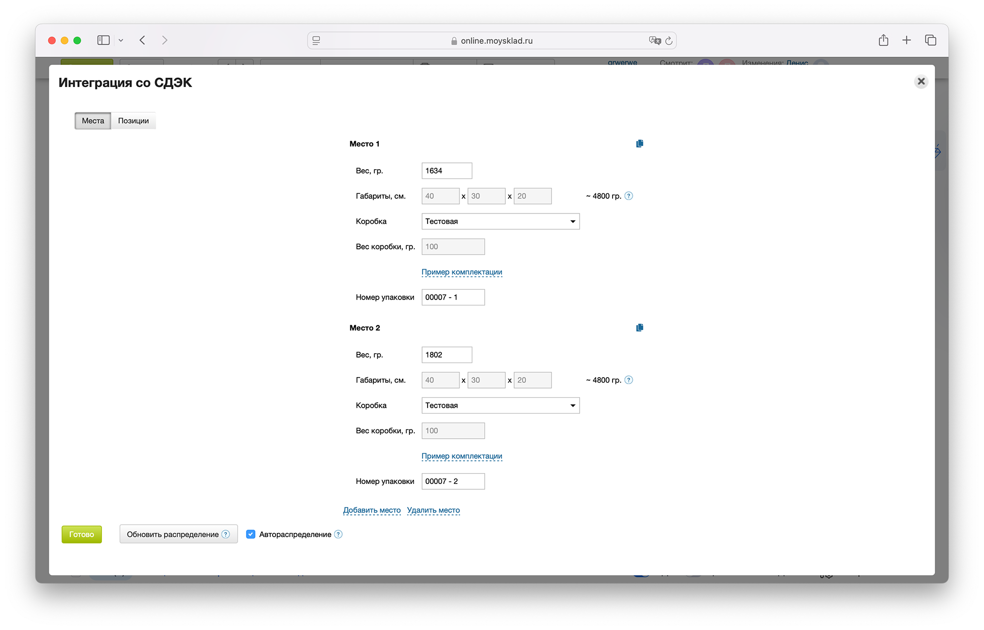 - Автоматическое распределение - (только для тарифа Плюс) интеграция самостоятельно подберет необходимое количество коробок и распределит по ним товары. Коробки заводятся вами в отдельной настройке, их можно использовать без автоматического распределения