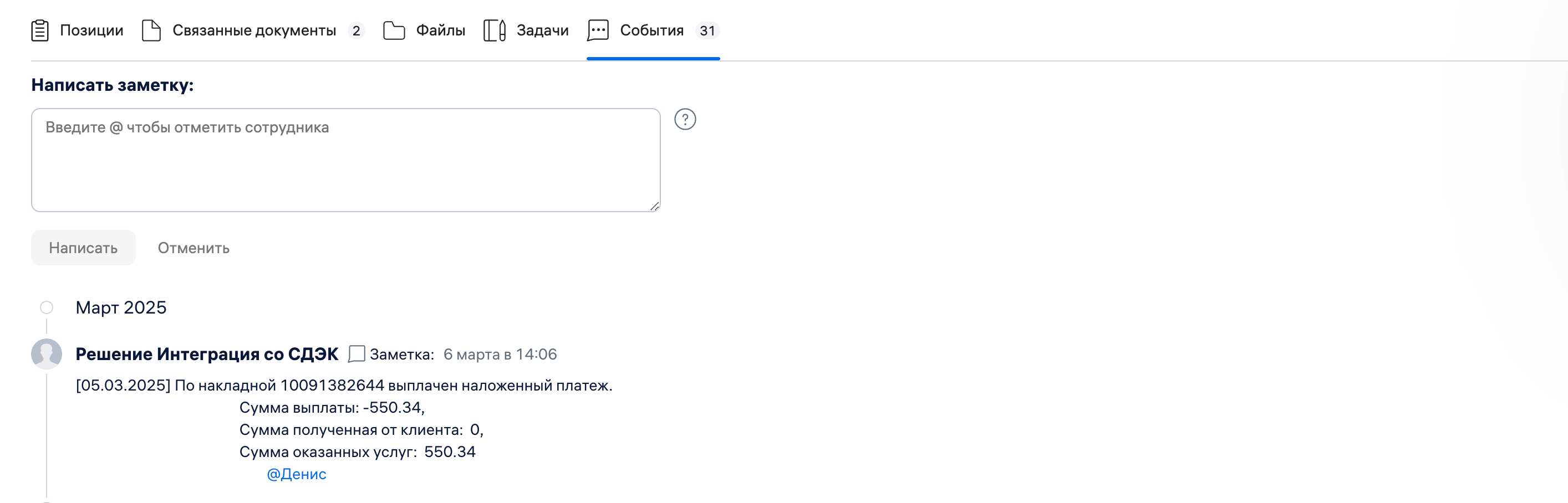 Так же можно включить уведомление пользователя при выплате наложенного платежа, данные добавятся в События документа с суммой выплаты и расходов на доставку