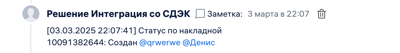 Если включено, при изменении статуса в СДЭК, выбранный пользователь получит уведомление в МоемСкладе