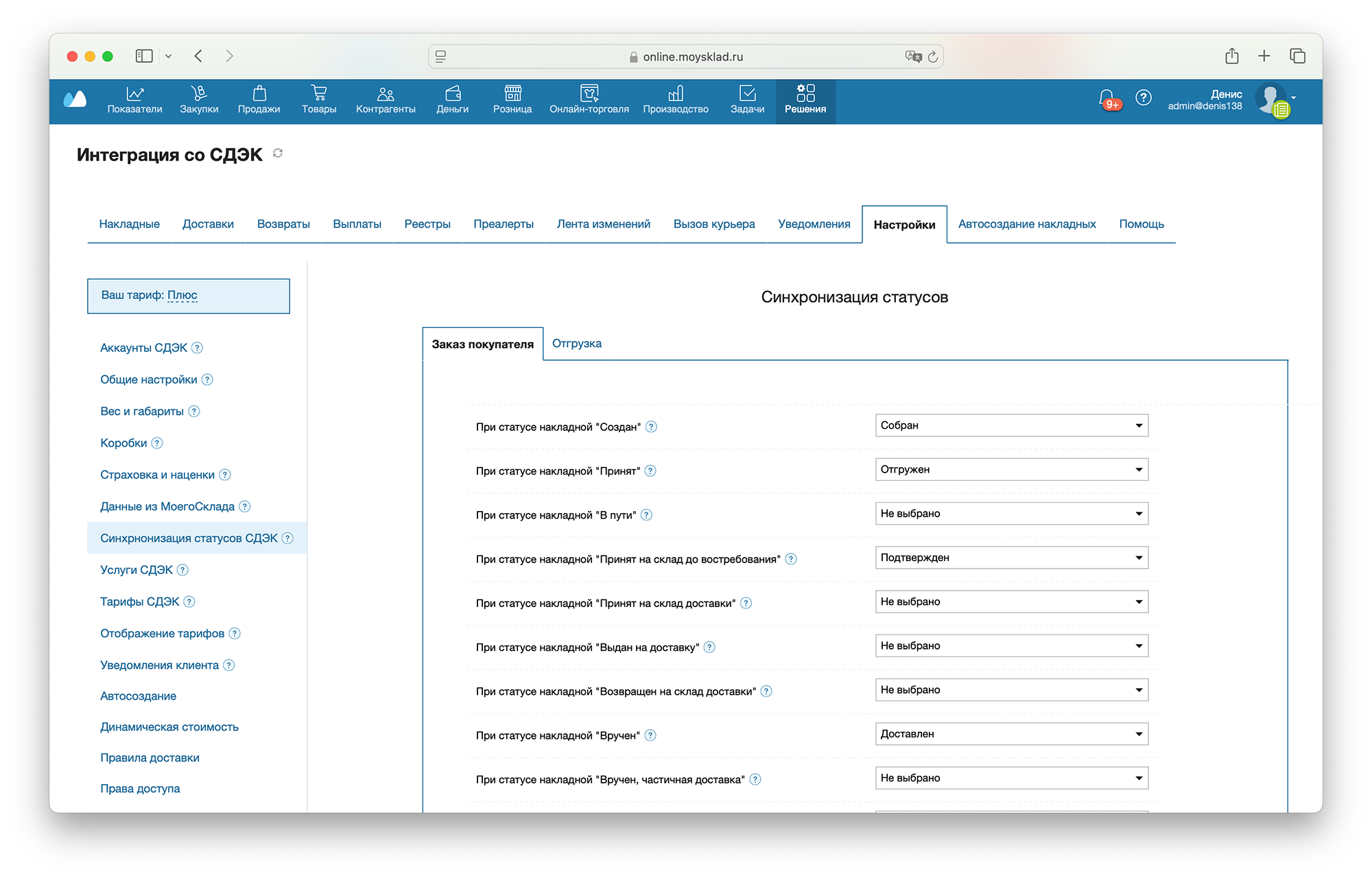 Раздел позволяет настроить сопоставление Статусов СДЭК и МойСклад При смене статуса в СДЭК - документ в МоемСкладе перейдет в выбранный статус