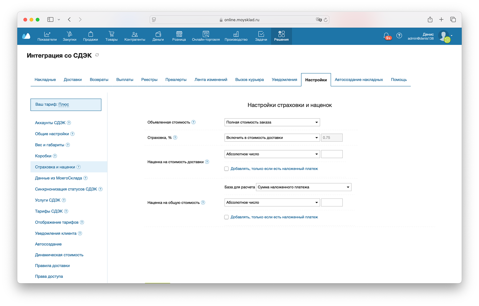 Страховка является обязательной для всех отправлений с объявленной стоимостью и равна 0.75%. Страховка учитывается в стоимости доставки по формуле: Стоимость доставки = Расчетная стоимость по тарифу + Стоимость заказа * 0.75%