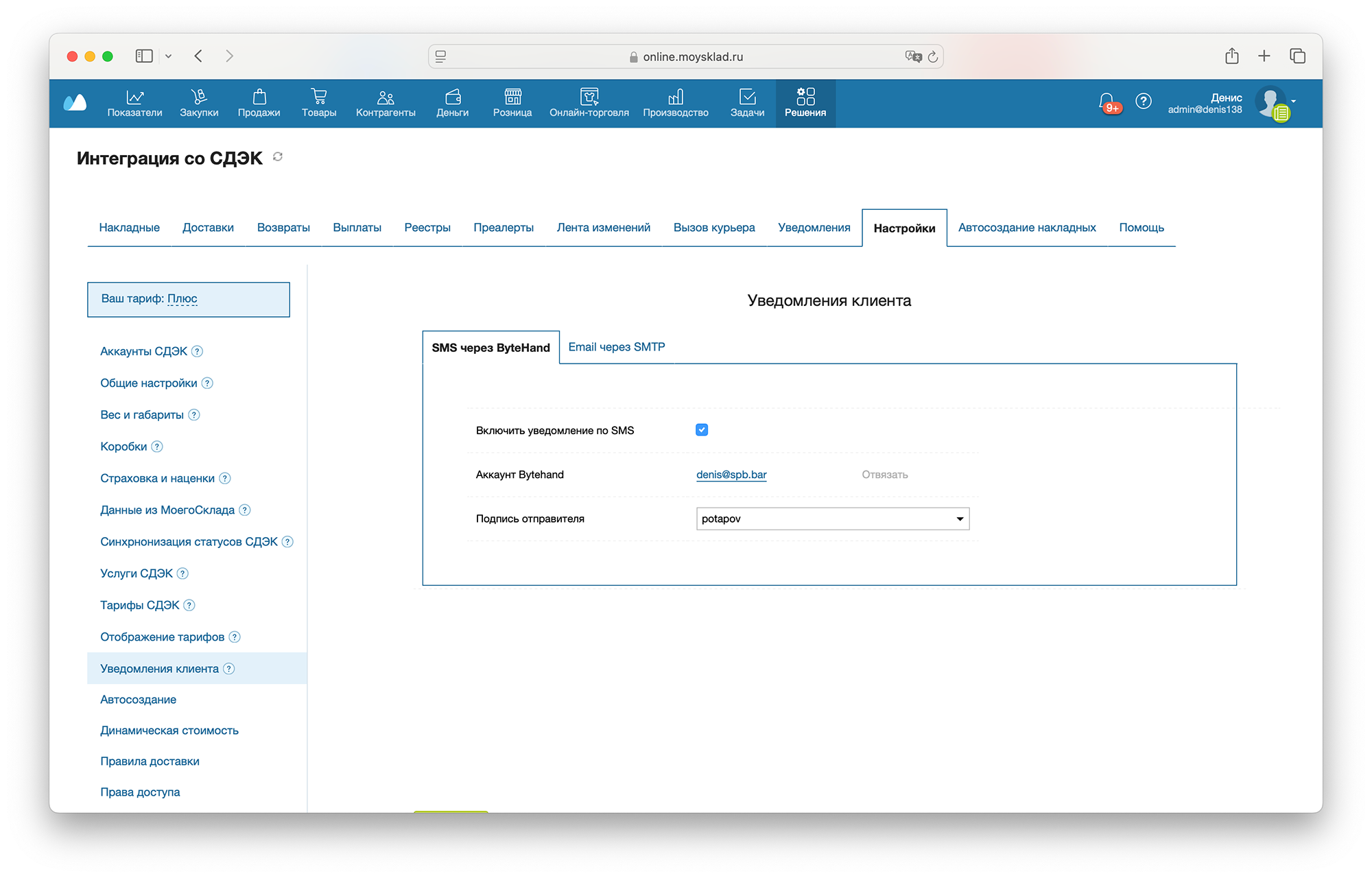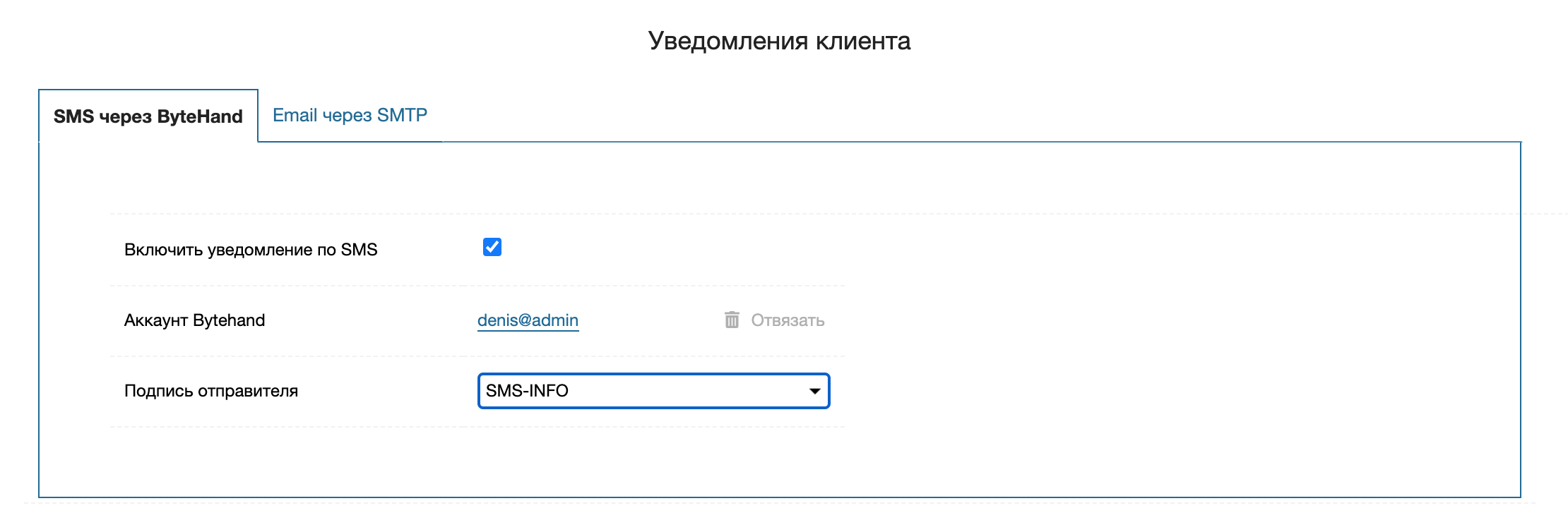 После предоставление доступа приложению, вы можете включить уведомления по SMS и выбрать подпись отправителя. Подробнее читайте в документации Bytehand