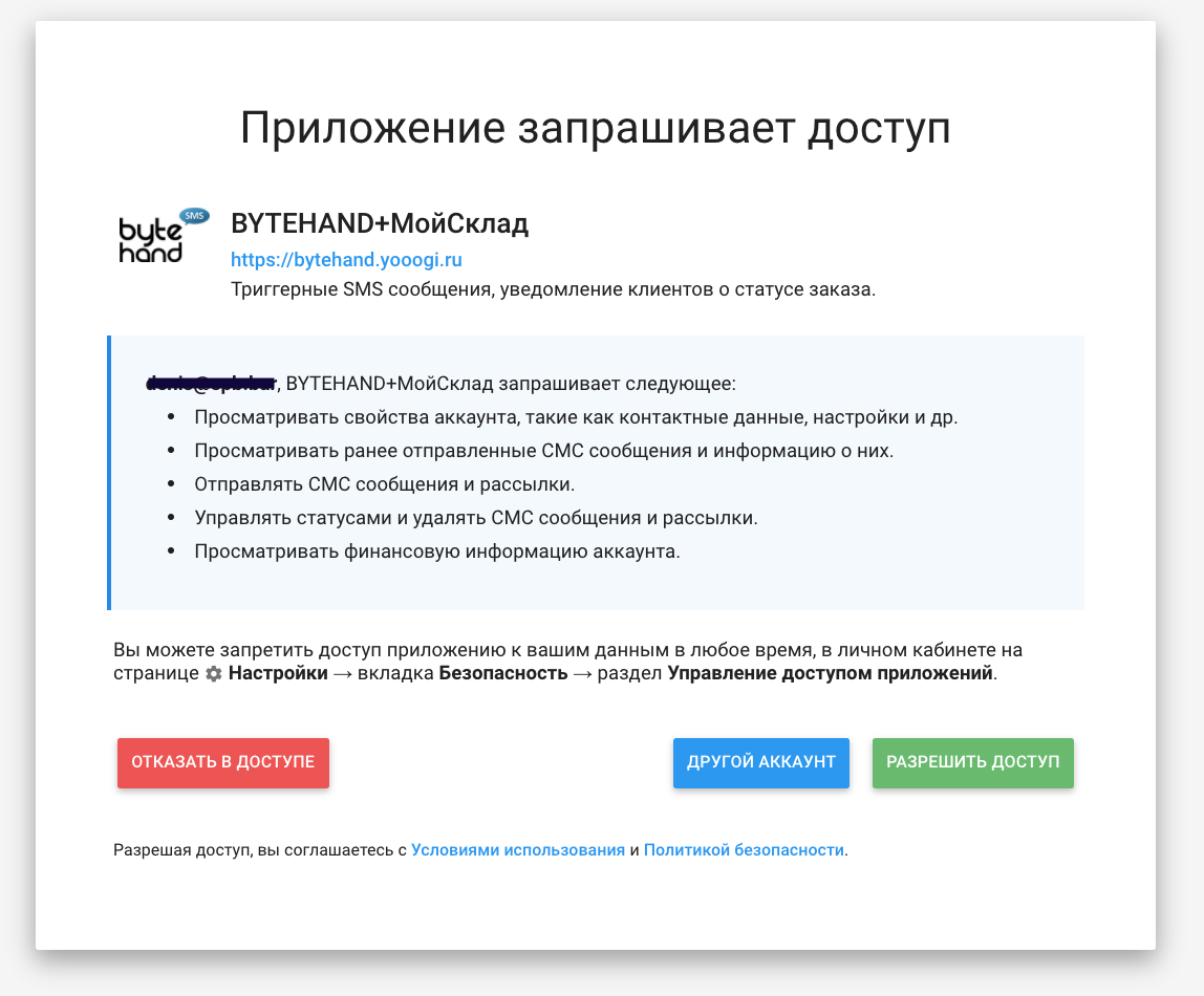 После входа вы увидите окно запроса доступа к аккаунту