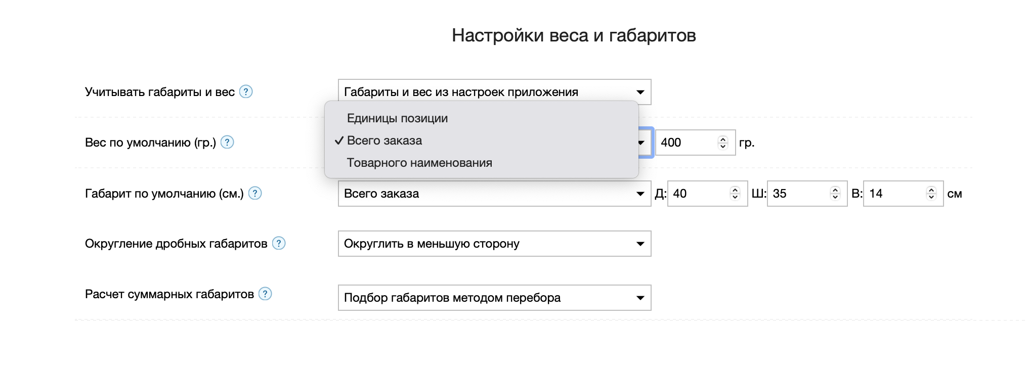 - Габариты и вес из настроек приложения. Для расчета стоимости будут использованы значения веса и габаритов из приложения