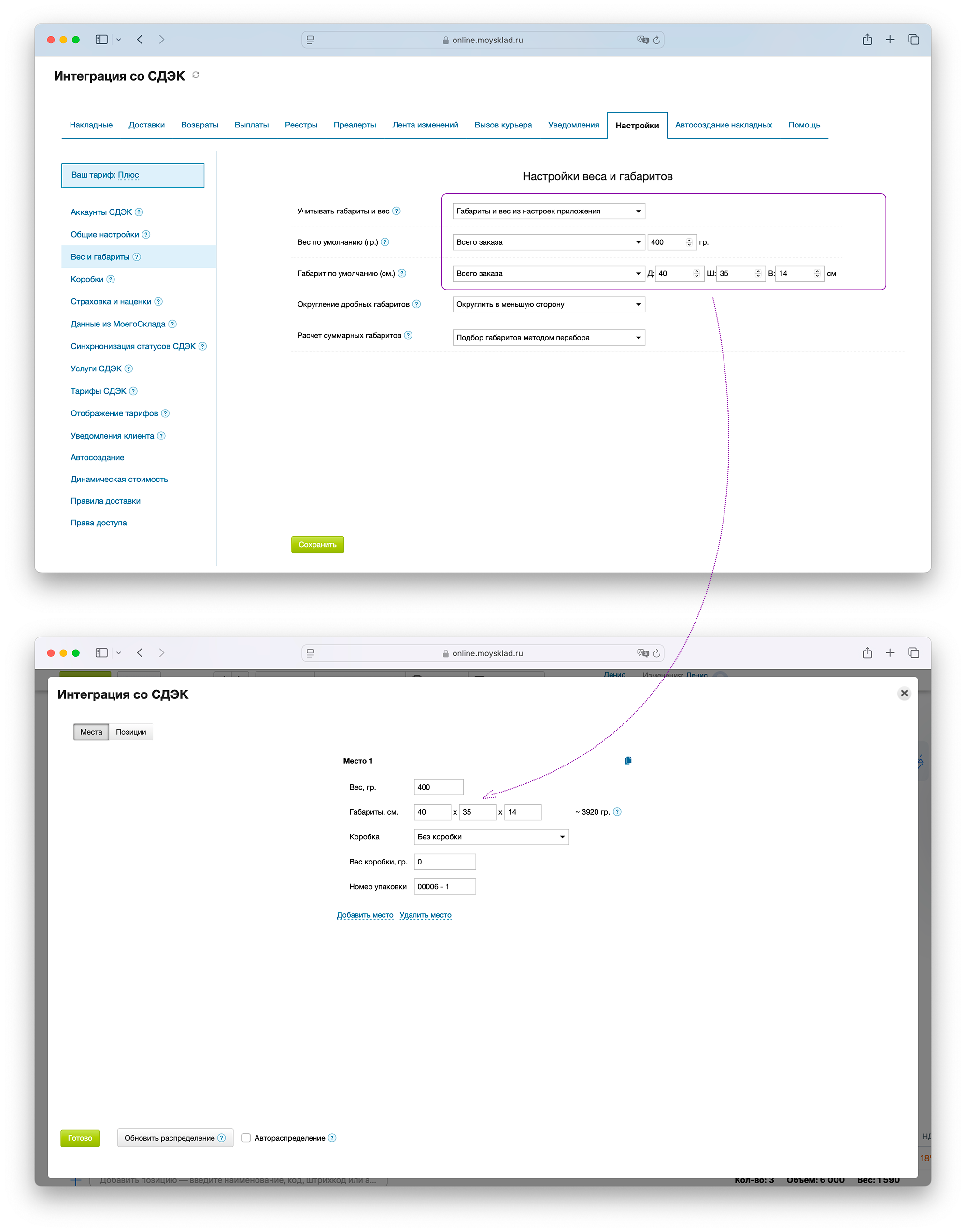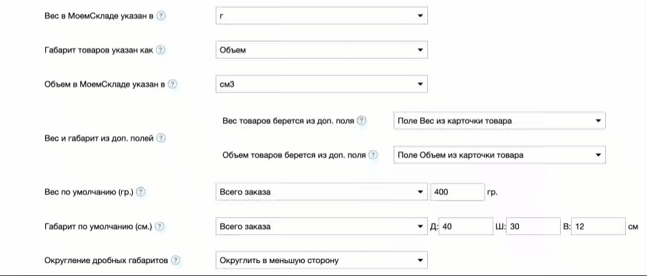 Данные настройки отвечают за корректную передачу значений веса и габаритов из МоегоСклада в СДЭК. На основании этих настроек будет рассчитаны параметры отправления в виджете приложения и при автоматическом создании накладных