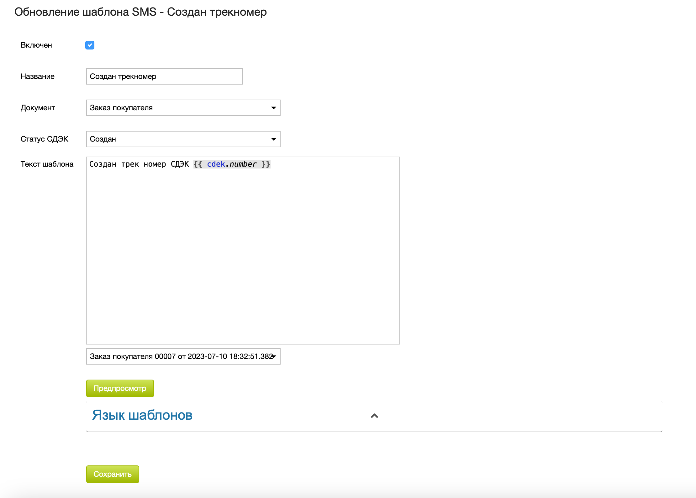 При создании шаблона для подстановки значений (например, сумма заказа, статус заказа, номер накладной) используйте язык шаблонизатора Liquid и подсказки Языка Шаблонов.