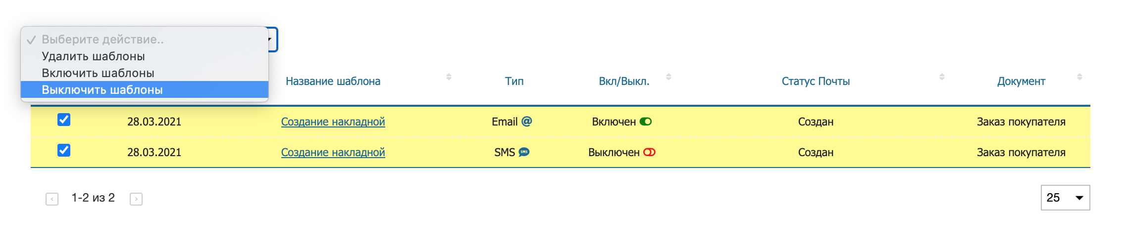 Для управление шаблонами необходимо выделить их галочками и выбрать необходимое действие (включение, выключение, удаление).