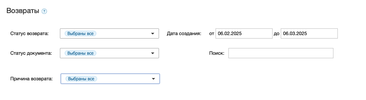 В разделе Возвраты отображаются все накладные, которые не были вручены покупателям (статус Не вручен), а так же возвратные накладные по этим заказам и их статусы, причины возврата и суммы за оказанные услуги СДЭК.