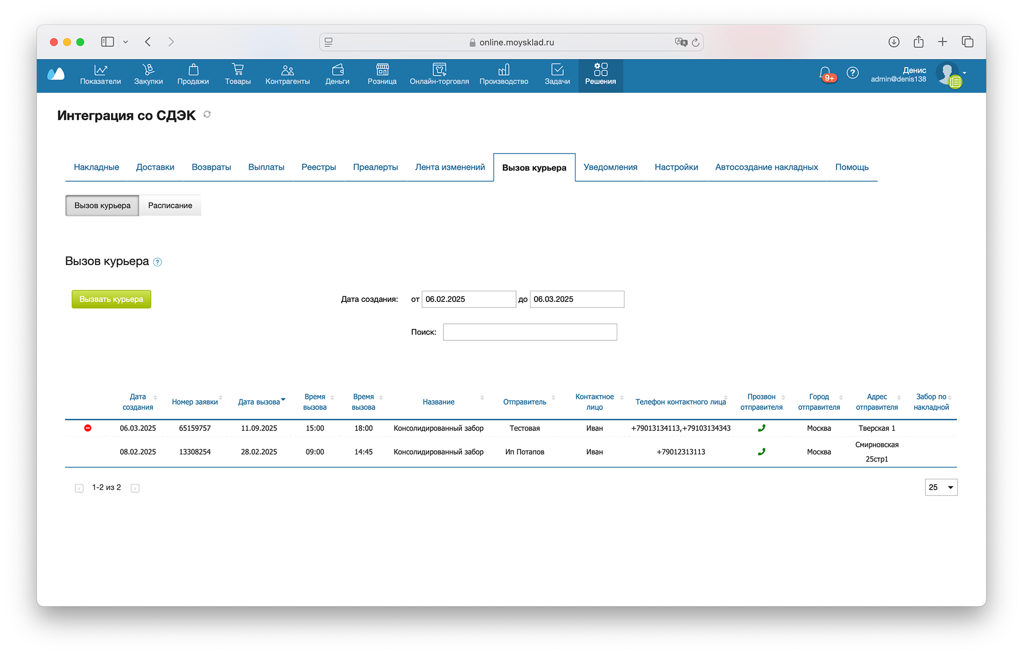 В интерфейсе доступна фильтрация заявок на вызов курьера по дате, а также поиск по полям вызова.