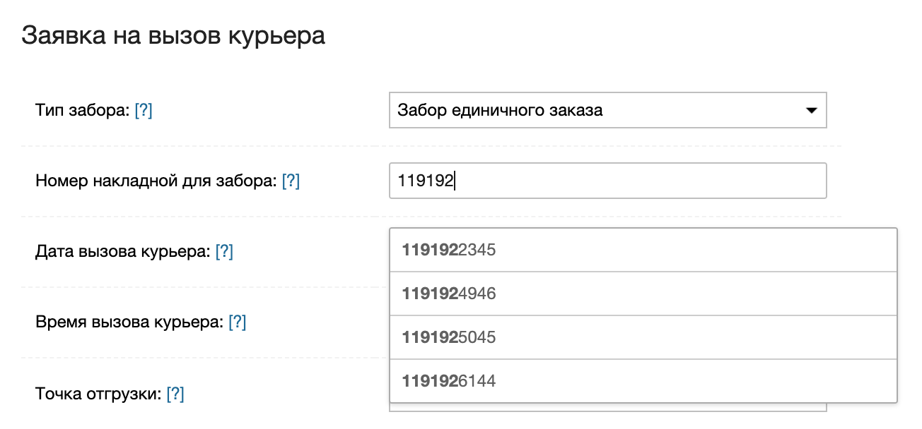 - Забор единичных заказов. Единичный забор используется, если вам нужно забрать один заказ, оформленный по тарифу От двери или От склада. В этом случае вам нужно указать номер накладной, для которой вызывается забор.
