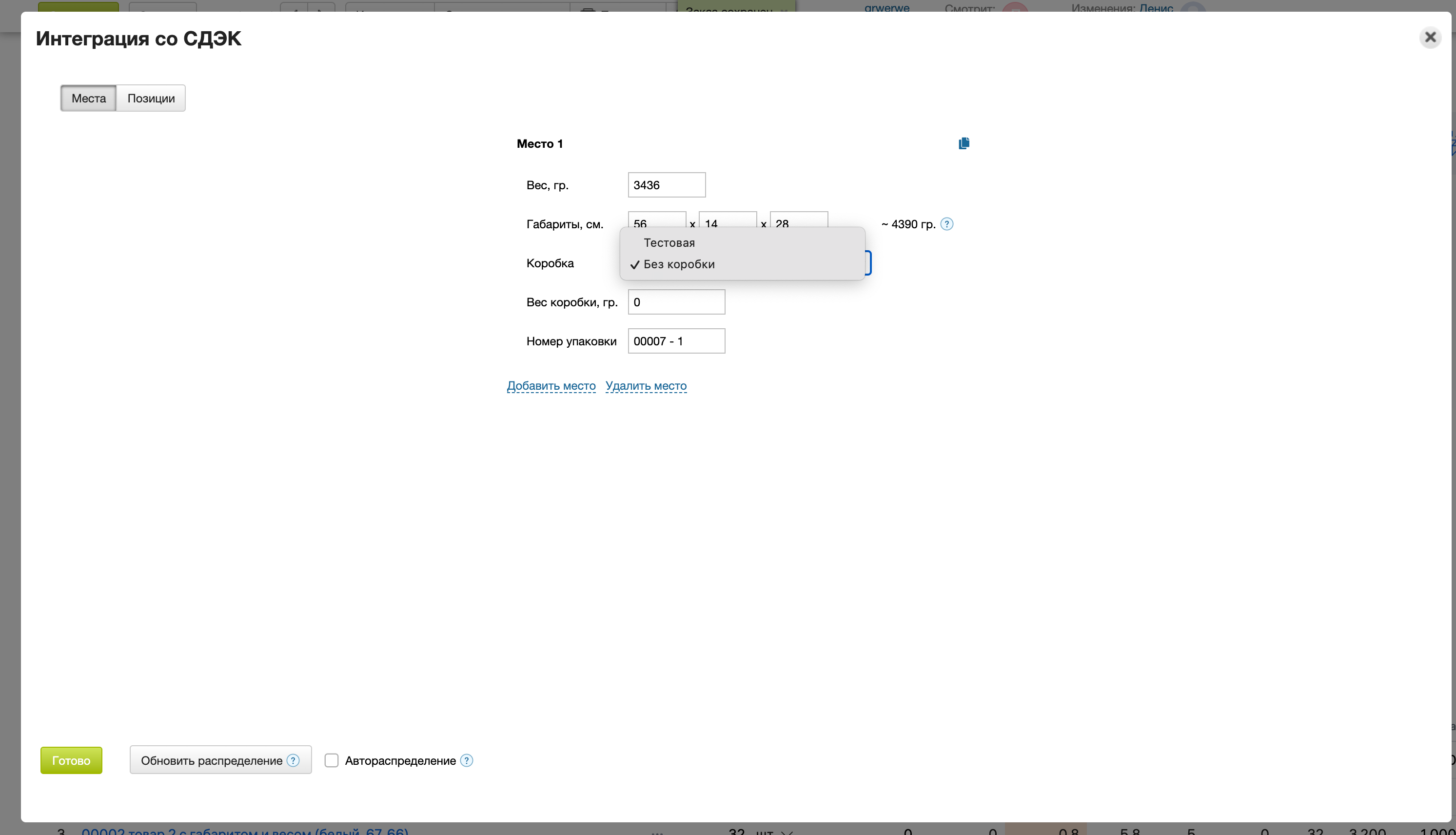 При включении опции Автораспределение, приложение автоматически разместит товары по заведенным вами в настройках коробкам, в соответствии с весом и габаритом товаров (только для тарифа Плюс)