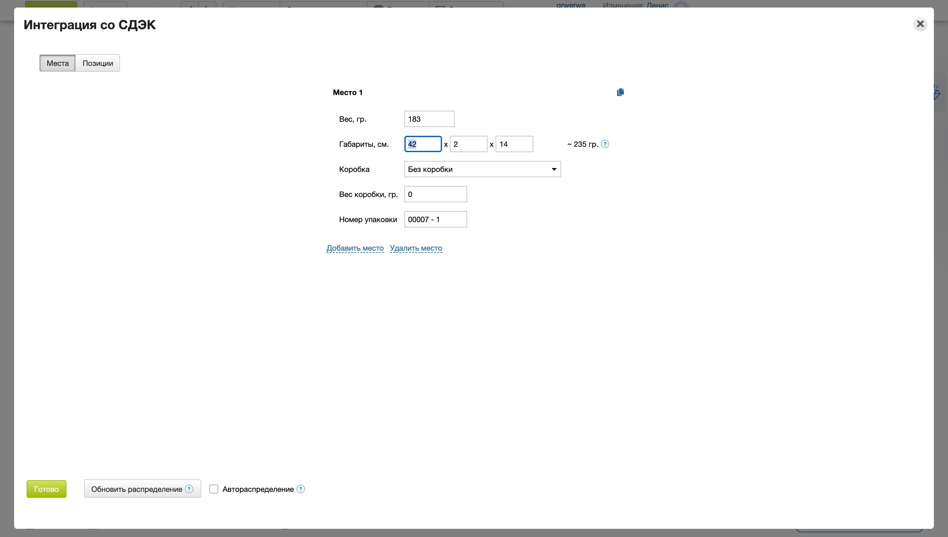 Этой опцией вы можете изменить количество мест в накладной, например когда по 1 заказу вы отправляете 2 коробки. При нажатии на иконку ✏️ около веса или габарита, вы можете указать габариты и вес мест: