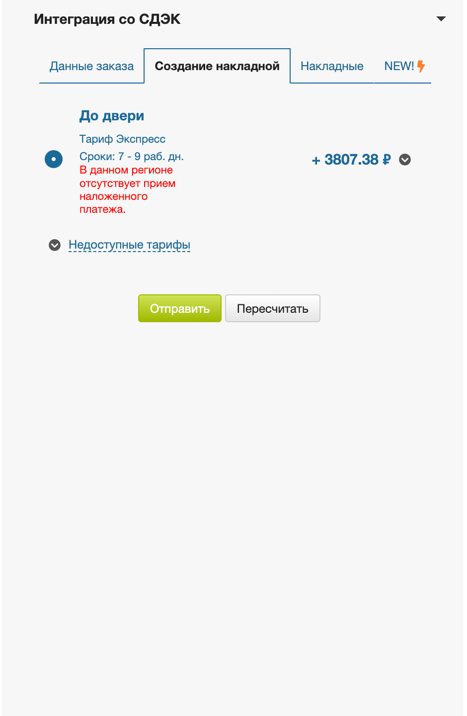 Если доставка по тарифу невозможна, вы можете увидеть причину во вкладке Недоступные тарифы, нажав на стрелку ⬇️