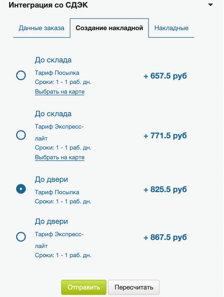 В этой части виджета выводятся точки ПВЗ и стоимость по тарифам, доступным для отправления по заданным параметрам из вкладки Данные заказа