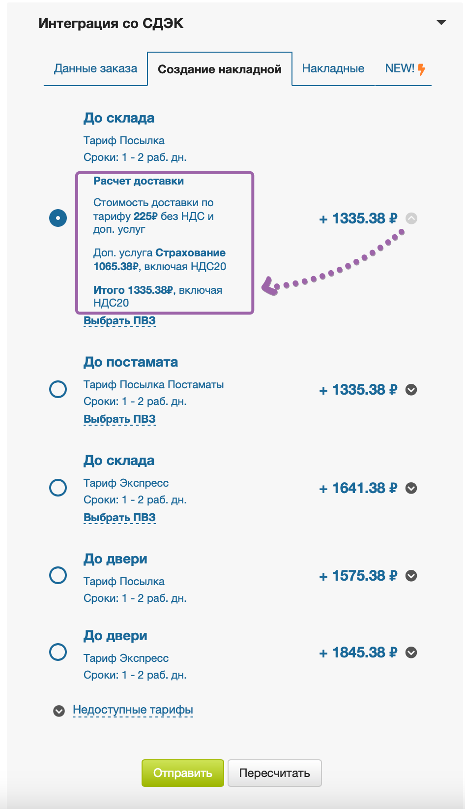 Если доставка по тарифу невозможна, вы можете увидеть причину во вкладке Недоступные тарифы, нажав на стрелку ⬇️