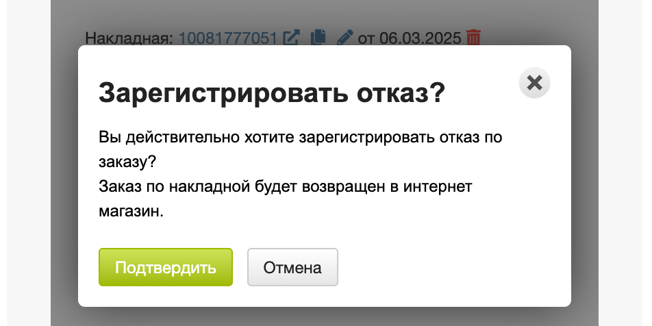 После подтверждения действия, заказ будет возвращен отправителю