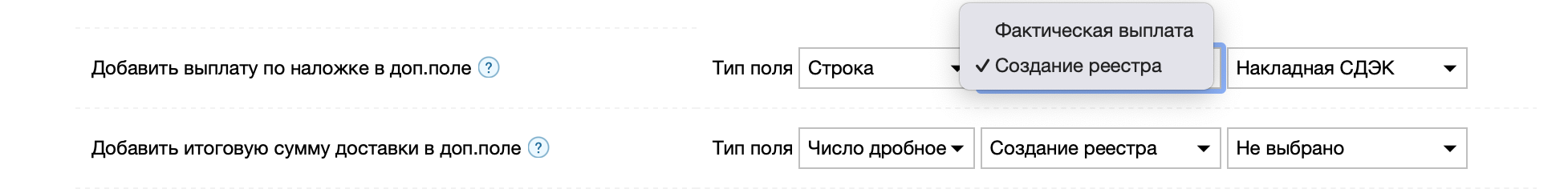 Опция позволяет транслировать ссылку на накладную СДЭК в доп. поле документа. При повторном создании накладной для одного и того же документа, ссылка будет заменена новой.