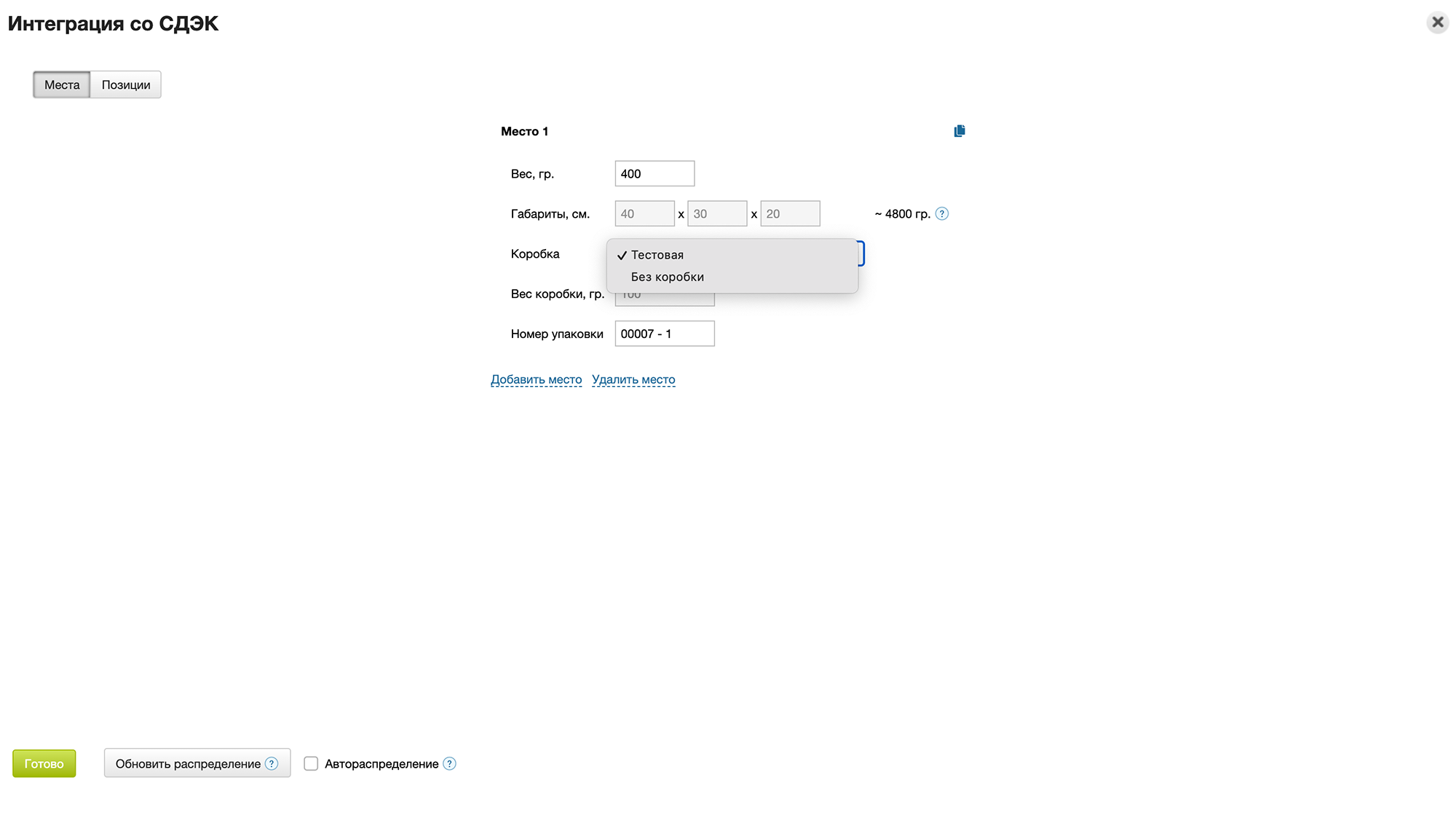 После добавления коробки, она будет доступна при редактировании мест в виджете приложения. При выборе коробки ее габарит принимается за габариты места, а вес добавляется к весу товаров