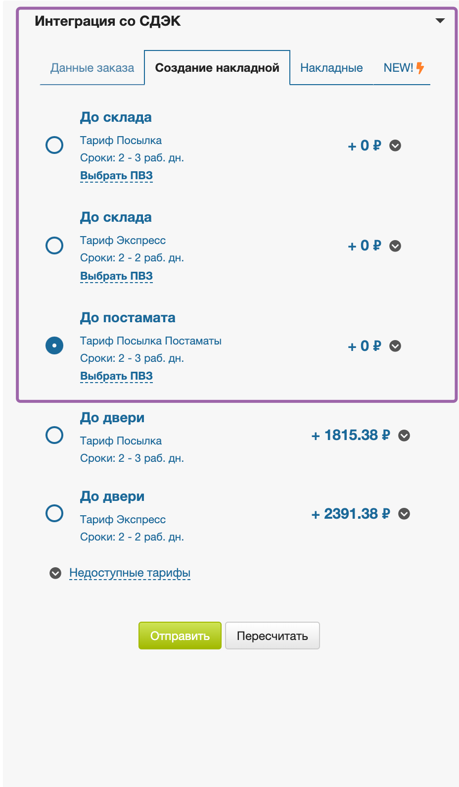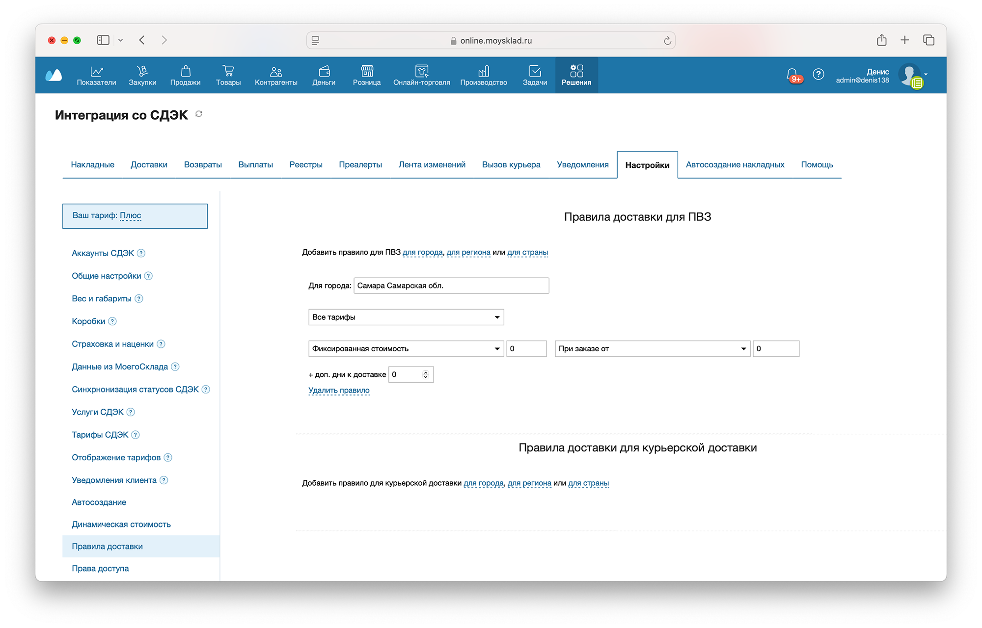 Вы можете задать правила расчета стоимости доставки как для курьерской доставки (до двери), так и до ПВЗ (до склада).