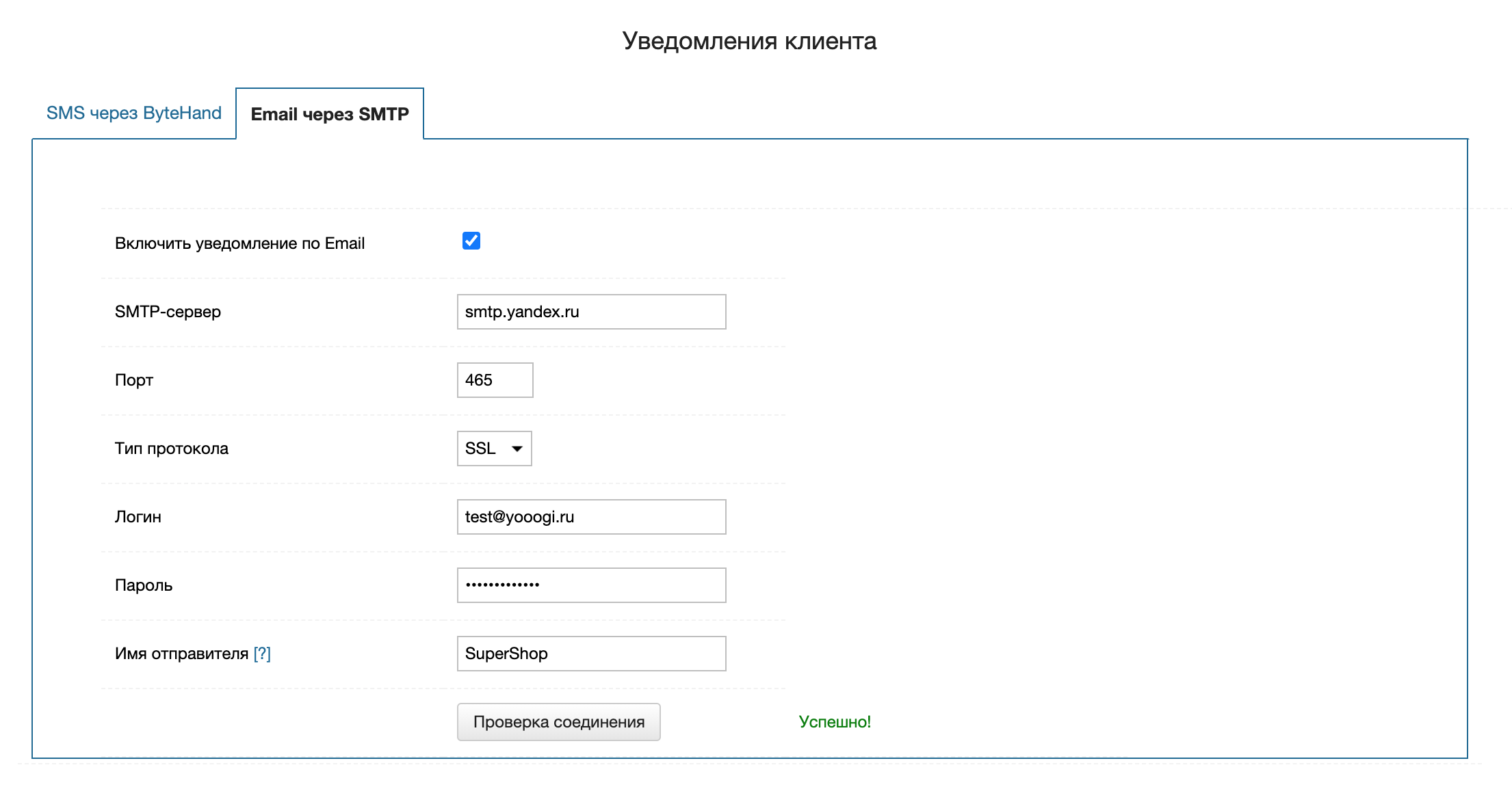 Данный раздел настроек позволяет вам задать настройки SMS и E-mail шлюзов для отправки уведомлений клиентам.