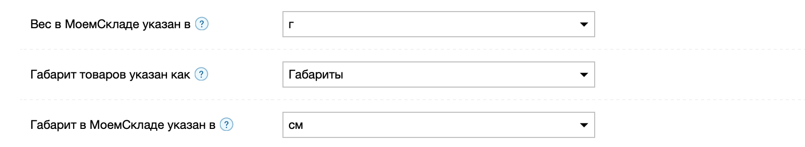 Если выбран вариант Использовать габариты и вес позиции, если они установлены в МойСклад, пользователю предлагается указать единицы измерения, в которых эти значения прописаны в карточке товара.