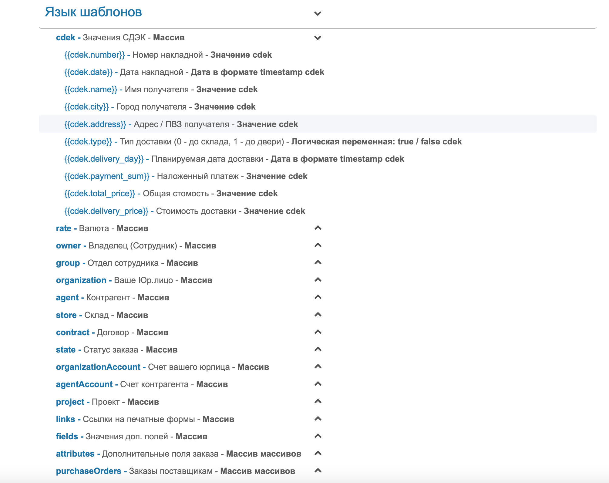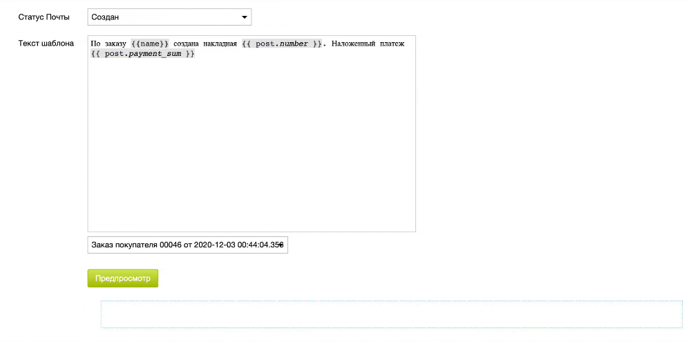 При создании шаблона для подстановки значений (например, сумма заказа, статус заказа, номер накладной) используйте язык шаблонизатора Liquid и подсказки Языка Шаблонов.