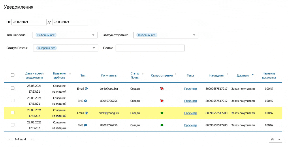 Во вкладке Уведомления отображаются все созданные SMS и E-mail уведомления клиентам, их текущие статусы отправки, тип, предпросмотр отправленного текста, раздел редактирования Шаблонов