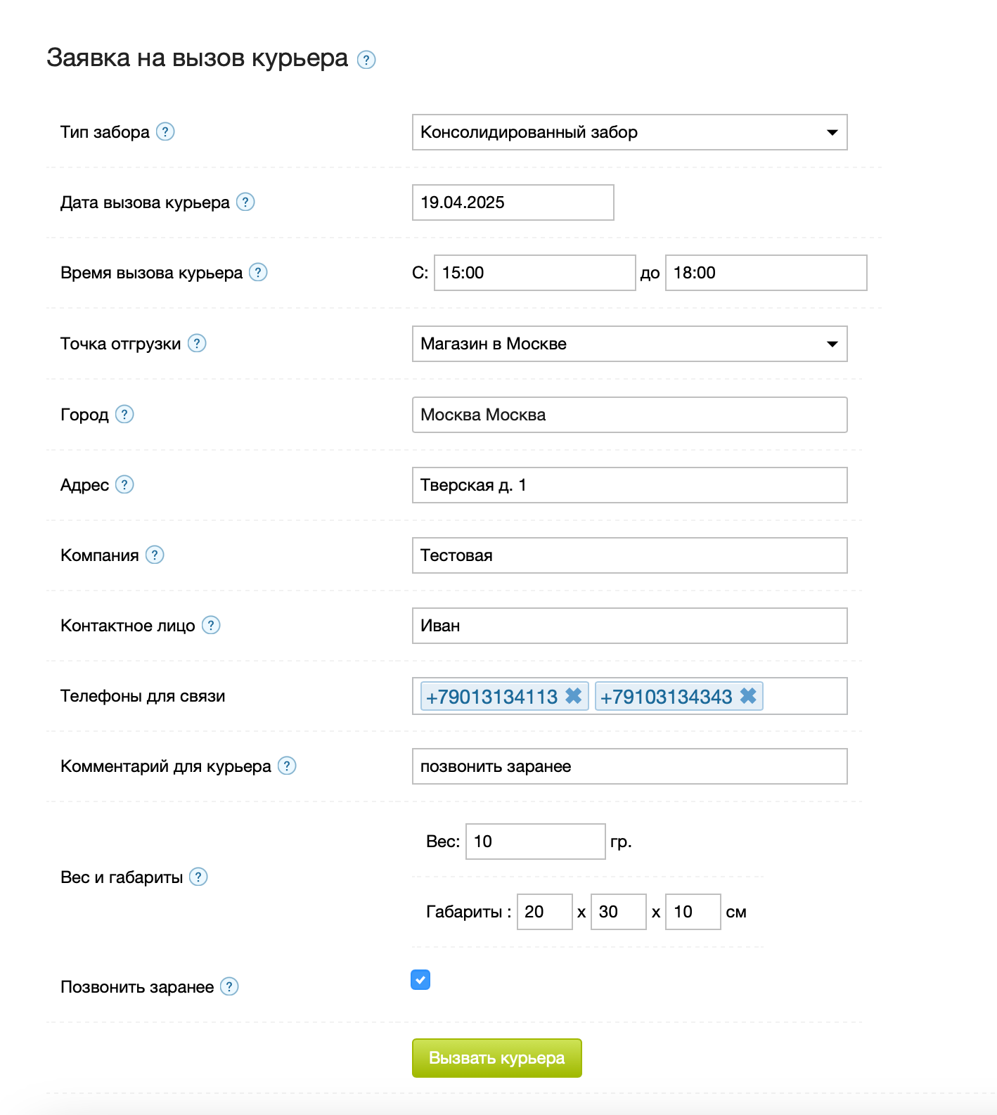 Подача заявки на вызов курьера