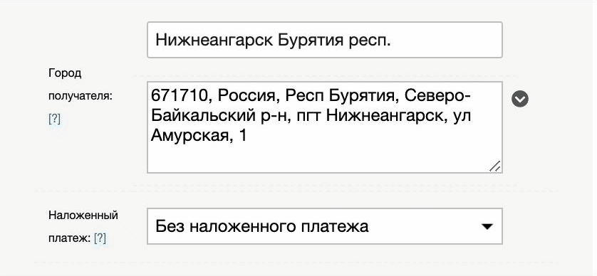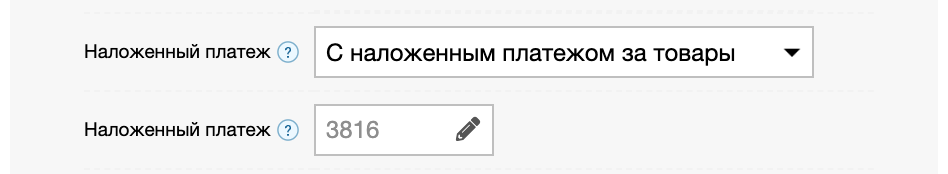 Если в регионе недоступен прием наложенного платежа, опция автоматически устанавливается в значение "Без наложенного платежа", а выбор "Наложенного платежа" становится недоступен пользователю.