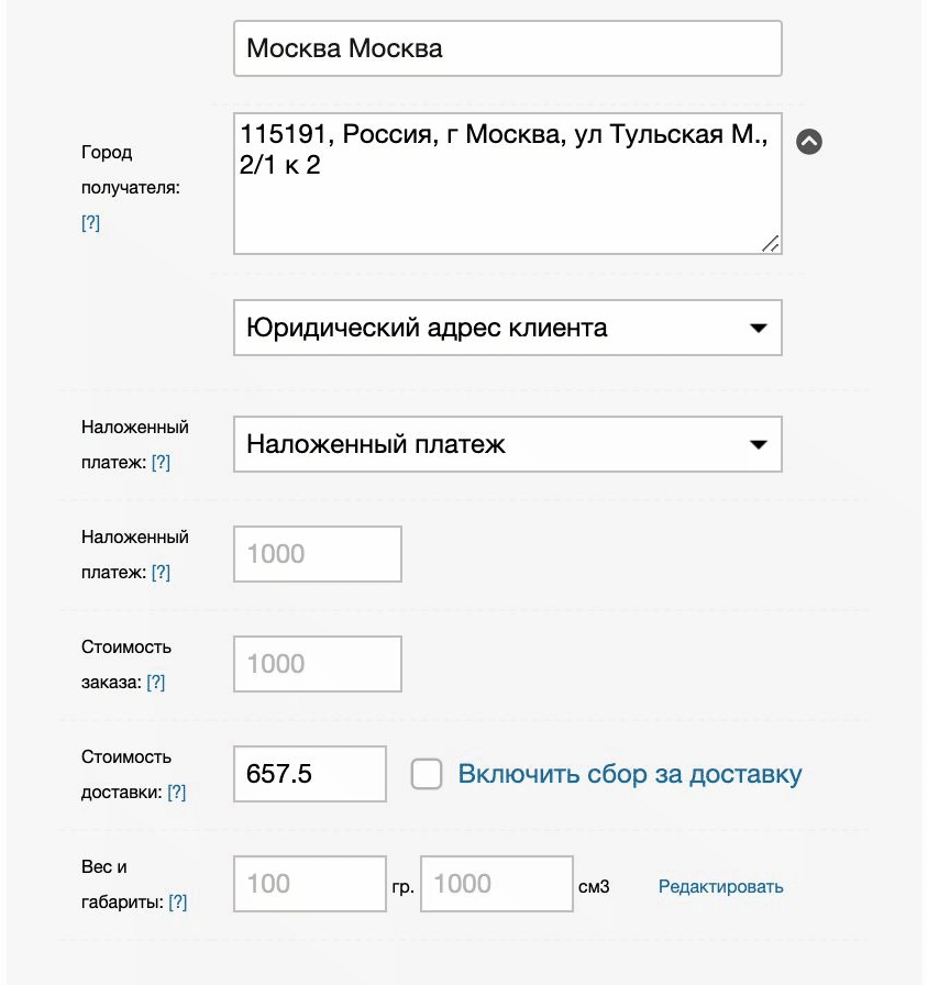 Чтобы отредактировать сумму сбора за доставку - вы можете указать нужную стоимость в поле Стоимость доставки. Рядом со стоимостью доставки появится иконка-лейбл, а стоимость по всем рассчитанным тарифам заменится на указанную. Чтобы вернуть исходное значение нужно кликнуть на иконку-лейбл ⬅️