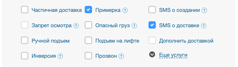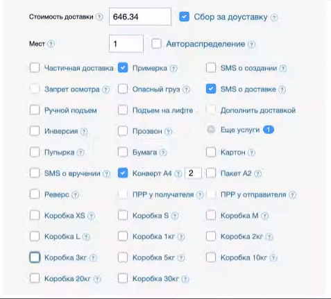 В этом разделе виджета отражены все включенные услуги, которые будут применены при создании накладной и расчете стоимости доставки. При изменении услуг стоимость доставки пересчитывается автоматически.