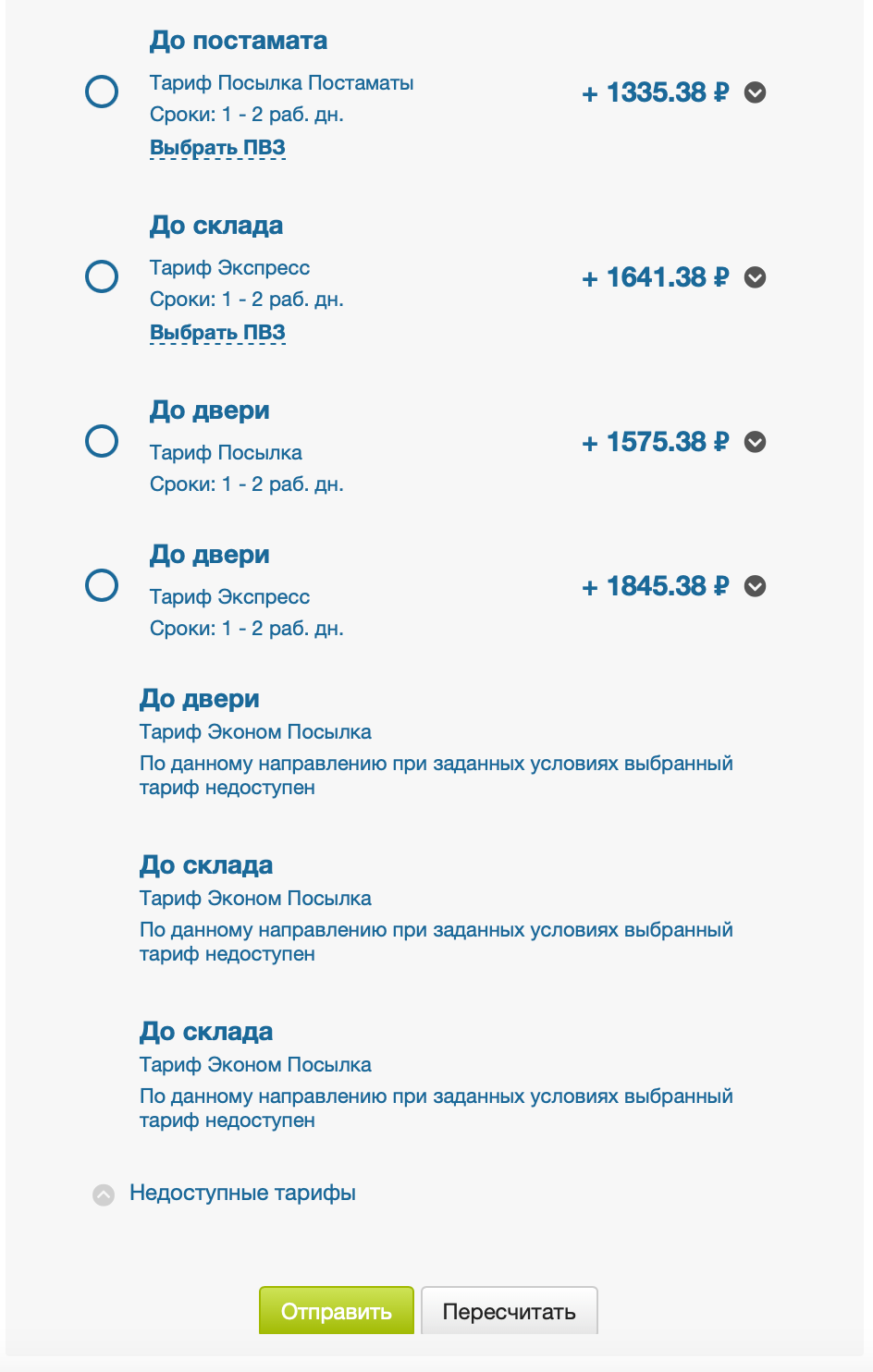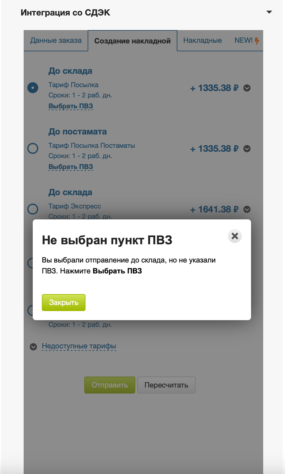 Если доставка по тарифу невозможна, вы можете увидеть причину во вкладке Недоступные тарифы, нажав на стрелку ⬇️