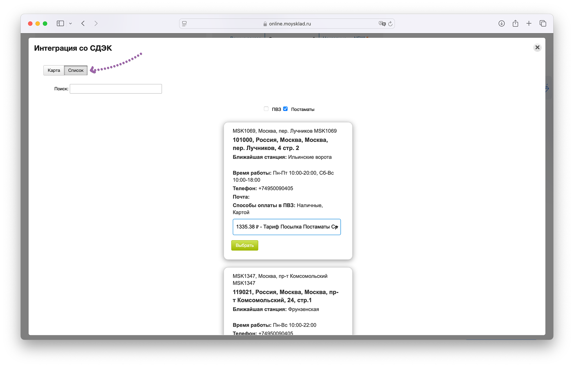 Так же есть возможность выбора ПВЗ из списка, для этого надо переключить режим на Список: