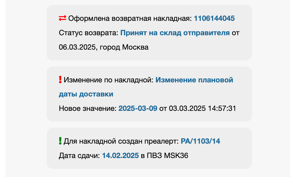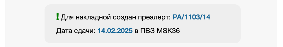 Если накладная находится в преалерте на сдачу в ПВЗ, информация по преалерту и выбранному ПВЗ и дате сдаче будет доступна в виджете