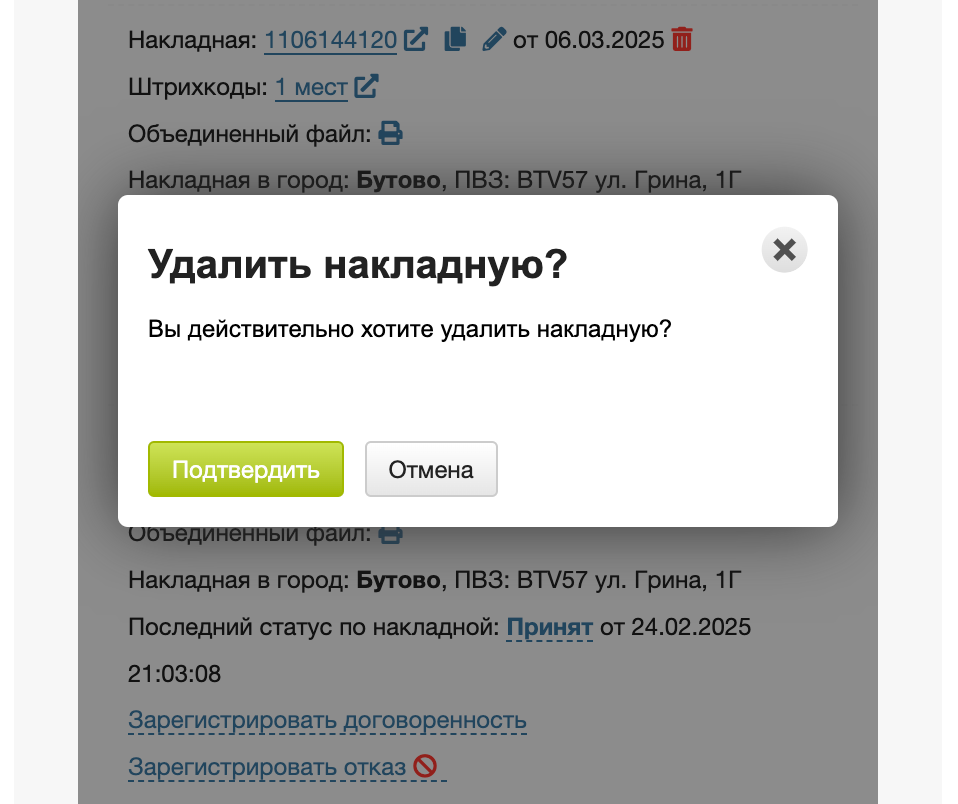 После подтверждения накладная будет удалена: