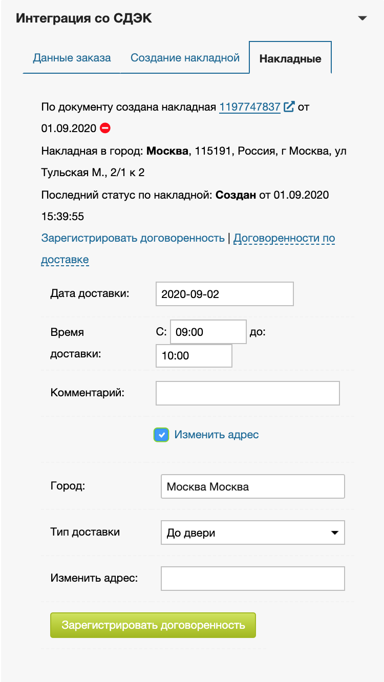 Опционально, по каждой накладной можно зарегистрировать договоренности по доставки. Это необязательный шаг, т.к. СДЭК сам может прозвонить клиента и договориться о доставке.